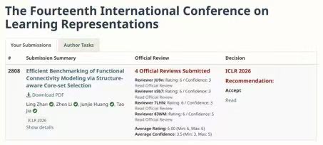 近日,我院“复杂系统与交叉科学应用”创新团队2022级博士生詹岭在导师贾韬教授指导下完成的研究成果被The International Conference on Learning Representations(ICLR 2026)录用。论文题为《Accelerating Benchmarking of Functional Connectivity Modeling via Structure-aware Core-set Selection》。